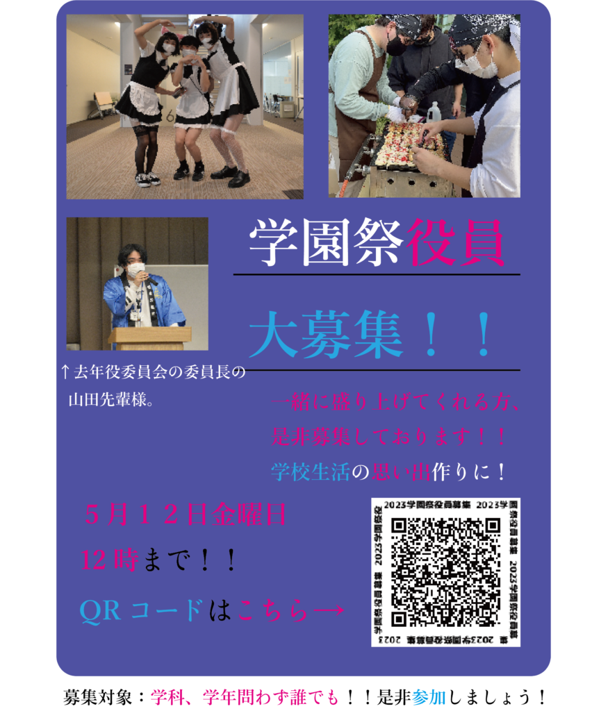 2年時に作った学園祭役員募集ポスター 未分類 2023年5月29日 前年、学園祭役員を務めたので、学園祭役員は楽しいぞ、そして、就活で言えるぞ(スマートな役割を担う)ということを伝えたくて、知的に青系で楽しげにデザインしました。 うまく的まとまっているとおもいます。デザインを作ることは楽しく、好きです。
